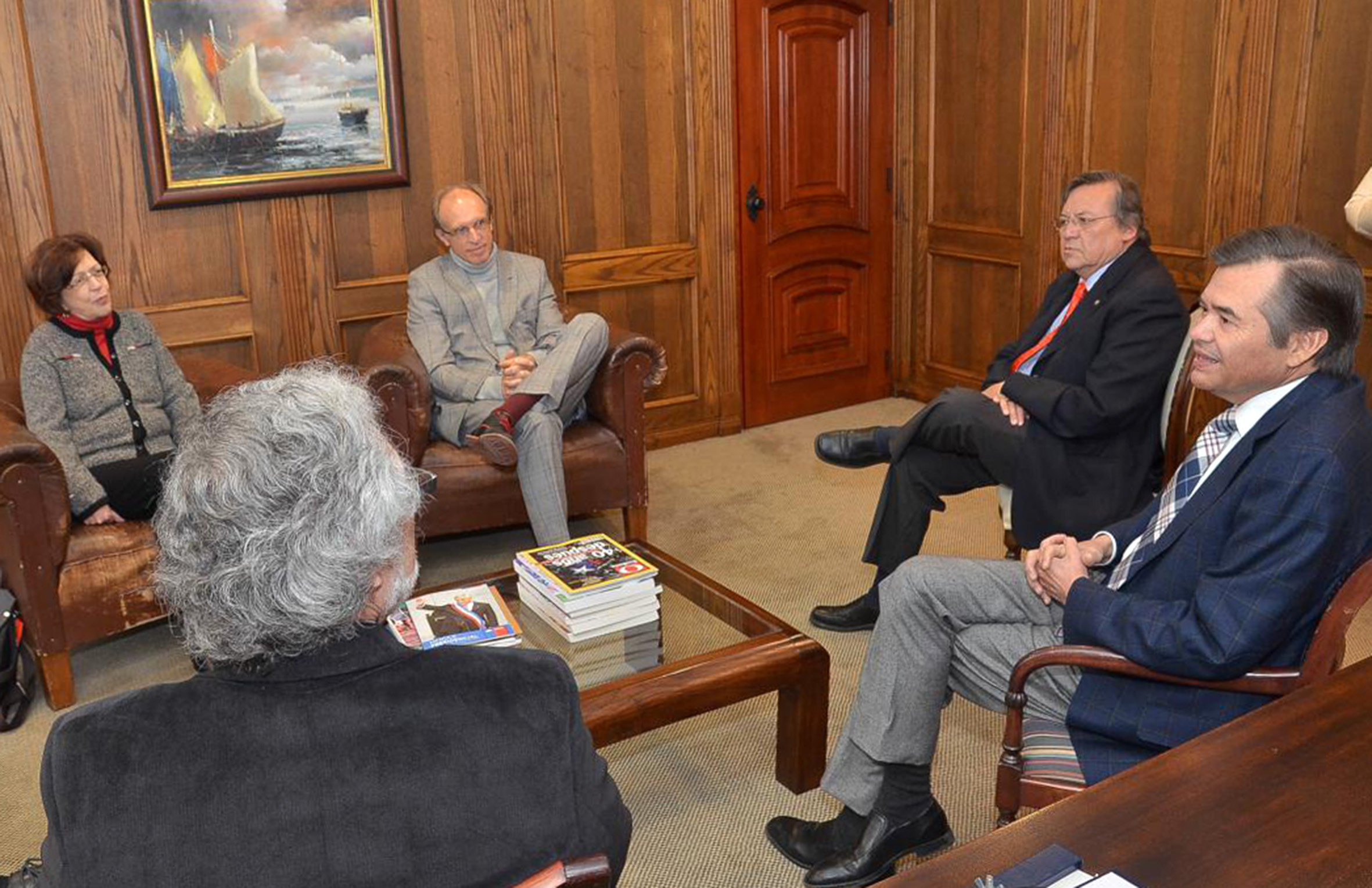 A partir da esquerda, Maria Helena Capelato, Martin Grossmann, Ricardo Herrera Lara, Sergio Bravo Escobar e de costas Raúl Sánchéz Gutiérrez