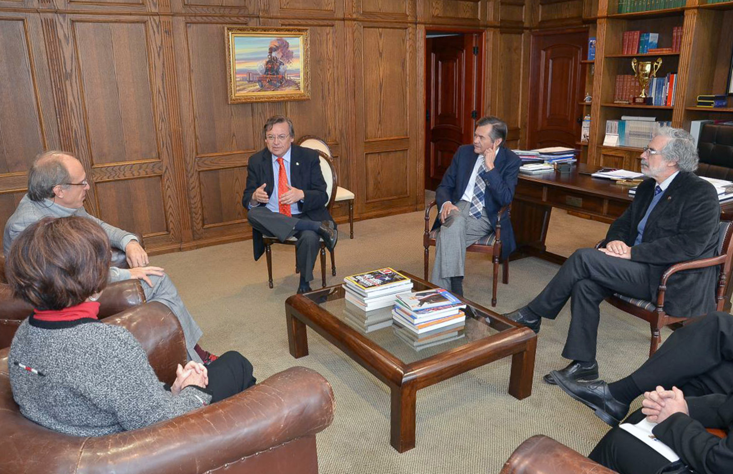 A partir da esquerda, Hugo Zunino Edelsberg, Maria Helena Capelato, Martin Grossmann, Ricardo Herrera Lara, Sergio Bravo Escobar e de costas Raúl Sánchéz Gutiérrez