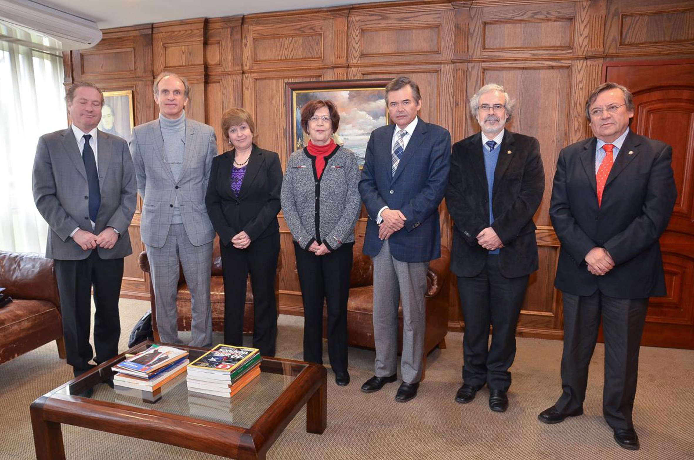 A partir da esquerda, Sergio Bravo Escobar, Raúl Sánchéz Gutiérrez, Hugo Zunino Edelsberg, Marianela Denegri Coria, Maria Helena Capelato, Martin Grossmann e Ricardo Herrera Lara de costas