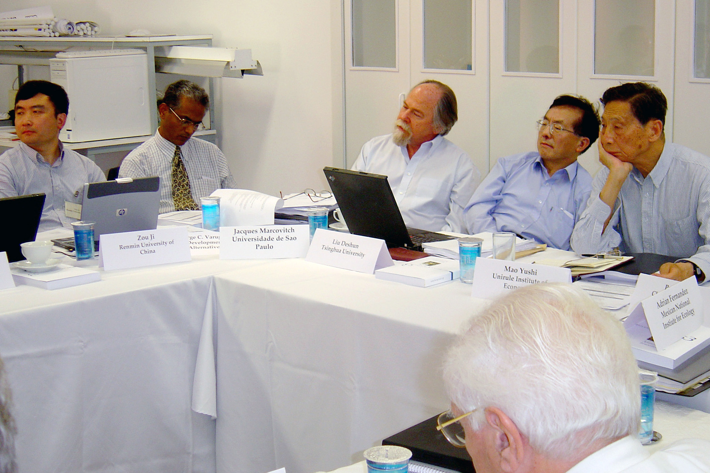 a partir da esquerda, Zou Ji, George Varughese, Jacques Marcovitch, Liu Deshun e Mao Yushi